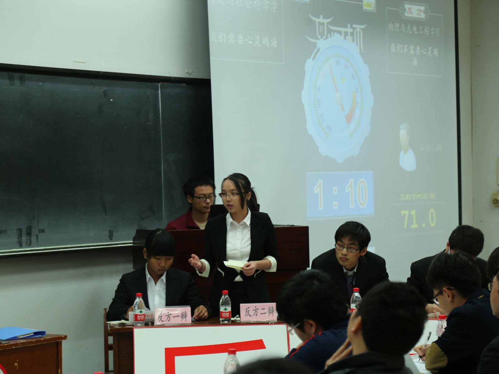 本次辩论,人文与社会科学学部为正方,辩题是“我们需要心灵鸡汤”;物理与光电工程学院为反方,辩题是”我们不需要心灵鸡汤”。正反双方依次在开场视频播放之后入场。