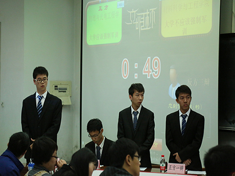 比赛第一阶段是开篇立论与盘问阶段,我院正方一辩陆泊涵同学对“大学应该强制军训”进行阐述。之后,反方四辩对正方一辩进行针对性盘问。接着由反方一辩进行阐述,正方四辩陈宇鹏同学对其进行了详细的盘问。第二阶段,双方二辩对对方的立论作驳论,正方二辩崔良铖与对方剑拔弩张,观众们爆发出热烈的掌声。第三阶段,正方三辩田晨予对反方一、二、四辩进行提问,他就军训的重要性进行了快速又详细的表述、发问。反过来,正方一、二、四辩对反方三辩的提问进行了回答。第四阶段,正方和反方进行了快速的交替发言。最后,双方辩手总结,评委点评,比赛结束,正方获胜。