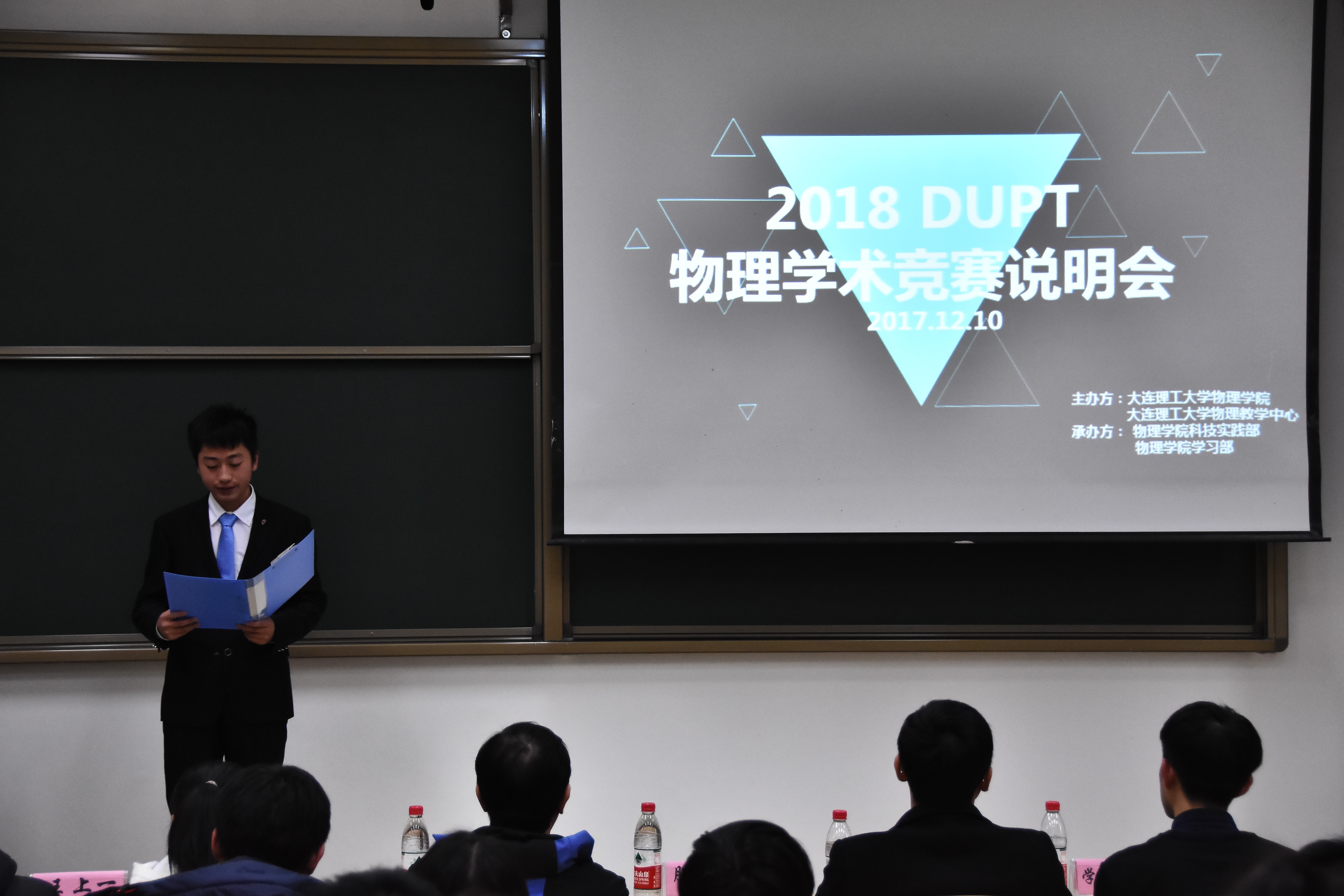 2017年12月10日,由科技实践部组织举办的2018物理学术竞赛说明会在建筑艺术馆118成功召开。出席本次会议的嘉宾有大连理工大学物理实验中心教师滕永杰、大连理工大学物理实验中心教师白洪亮、16国赛单项奖得主陈天乙、17国赛队长王上一,以及各位学生教练。